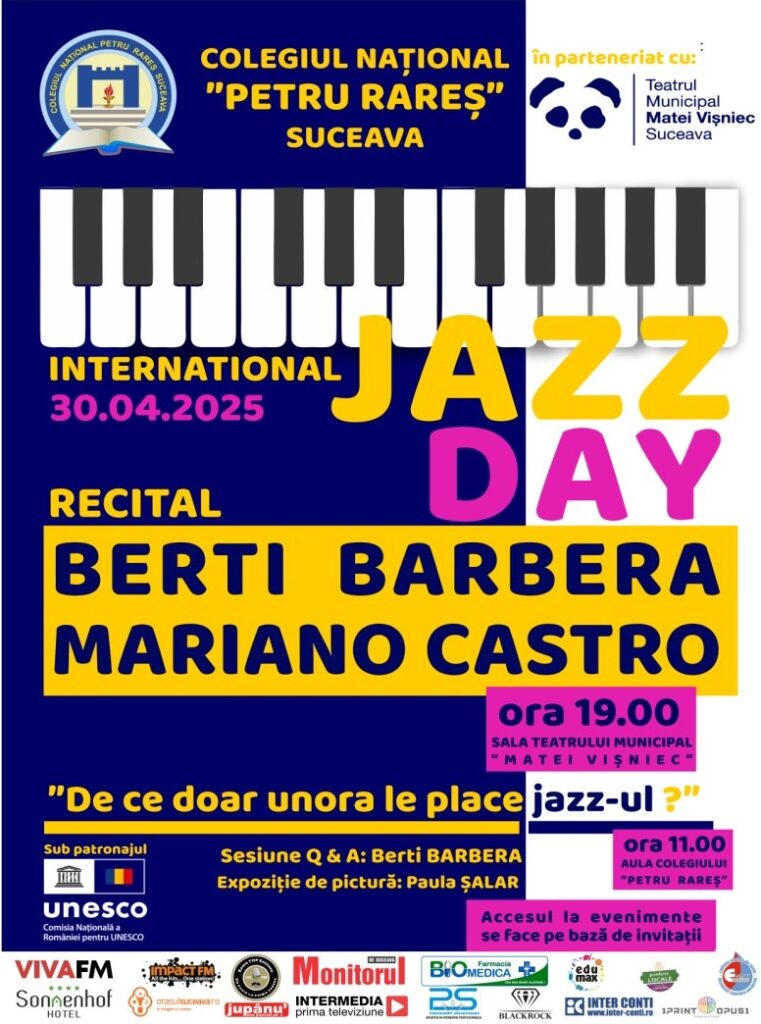 Miercuri, 30 aprilie 2025, cu prilejul Zilei Internaționale a Jazzului, Colegiul Național „Petru Rareș” Suceava dăruiește comunității educative sucevene un eveniment cultural de excepție: „De ce doar unora le place jazzul ?”, o celebrare a artei, a muzicii și a dialogului intercultural. Proiectul, desfășurat sub patronajul Comisiei Naționale a României pentru UNESCO își propune să aducă jazzul mai aproape de tineri și de comunitatea locală, oferind o experiență culturală completă – de la muzică live, la expoziție de artă și întâlniri inspiraționale cu artiști de renume.
